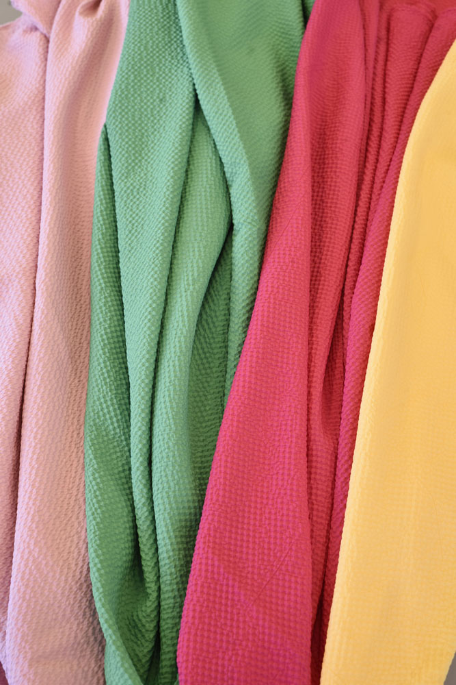Hazırlanan kreasyonlarımızda %100 pamuk, pamuk/polyester, pamuk/viskon, pamuk/keten, melanj ve akrilik karışımlı kumaşlar içeriğine göre istenilen gramajlar esas alınarak özenle üretilmektedir.